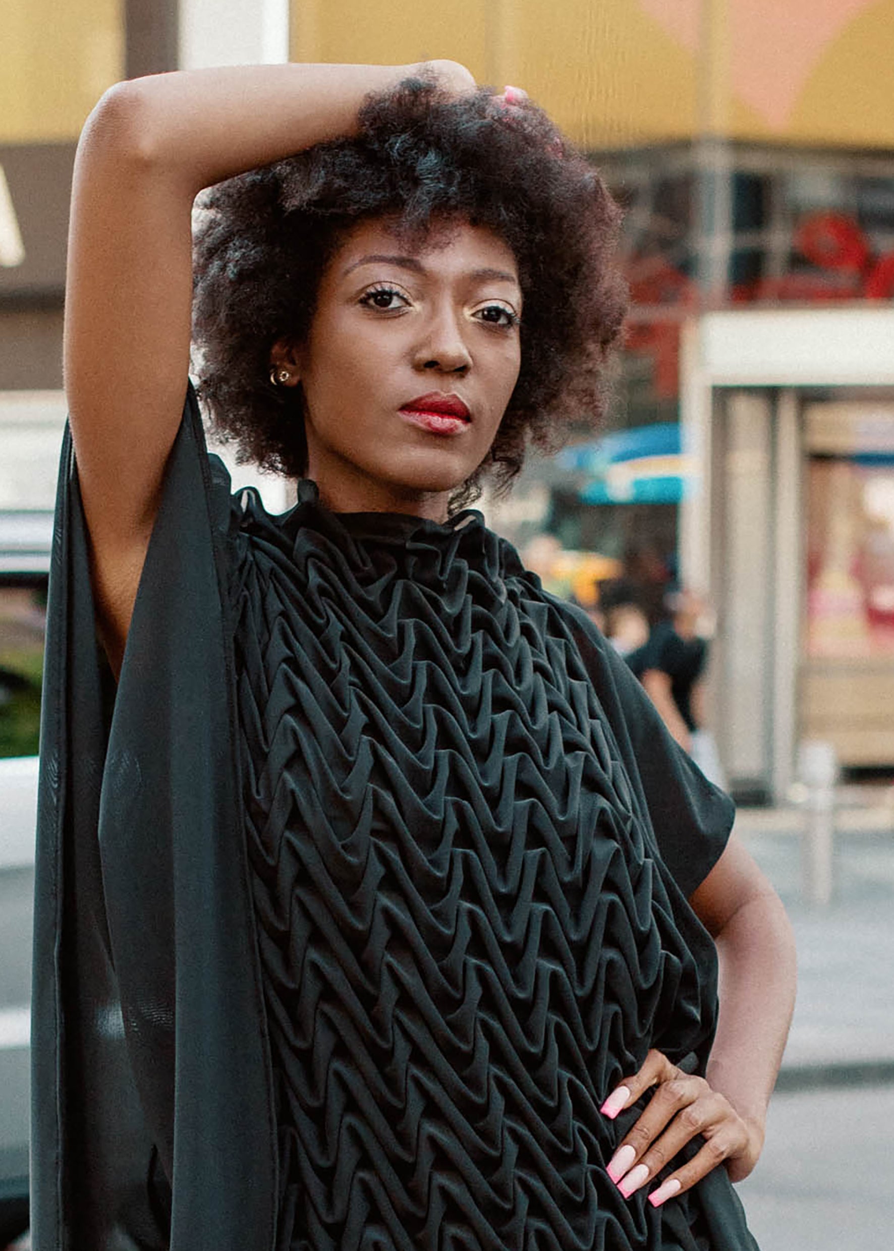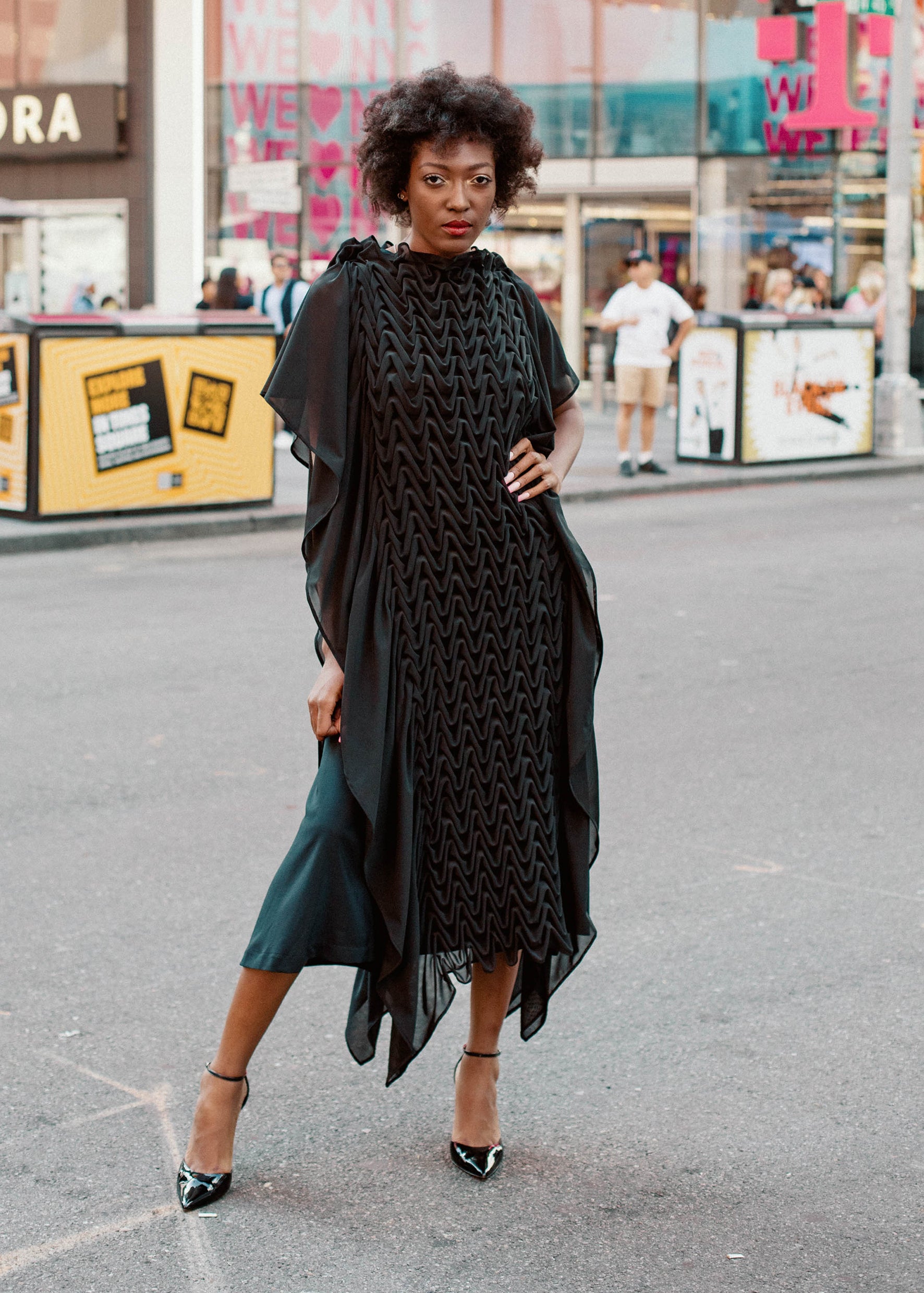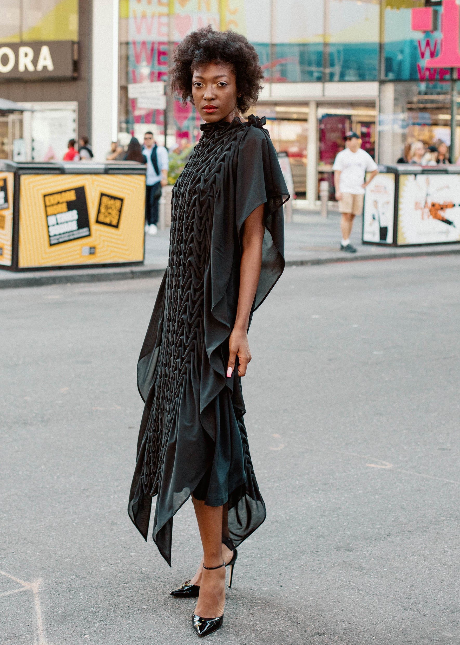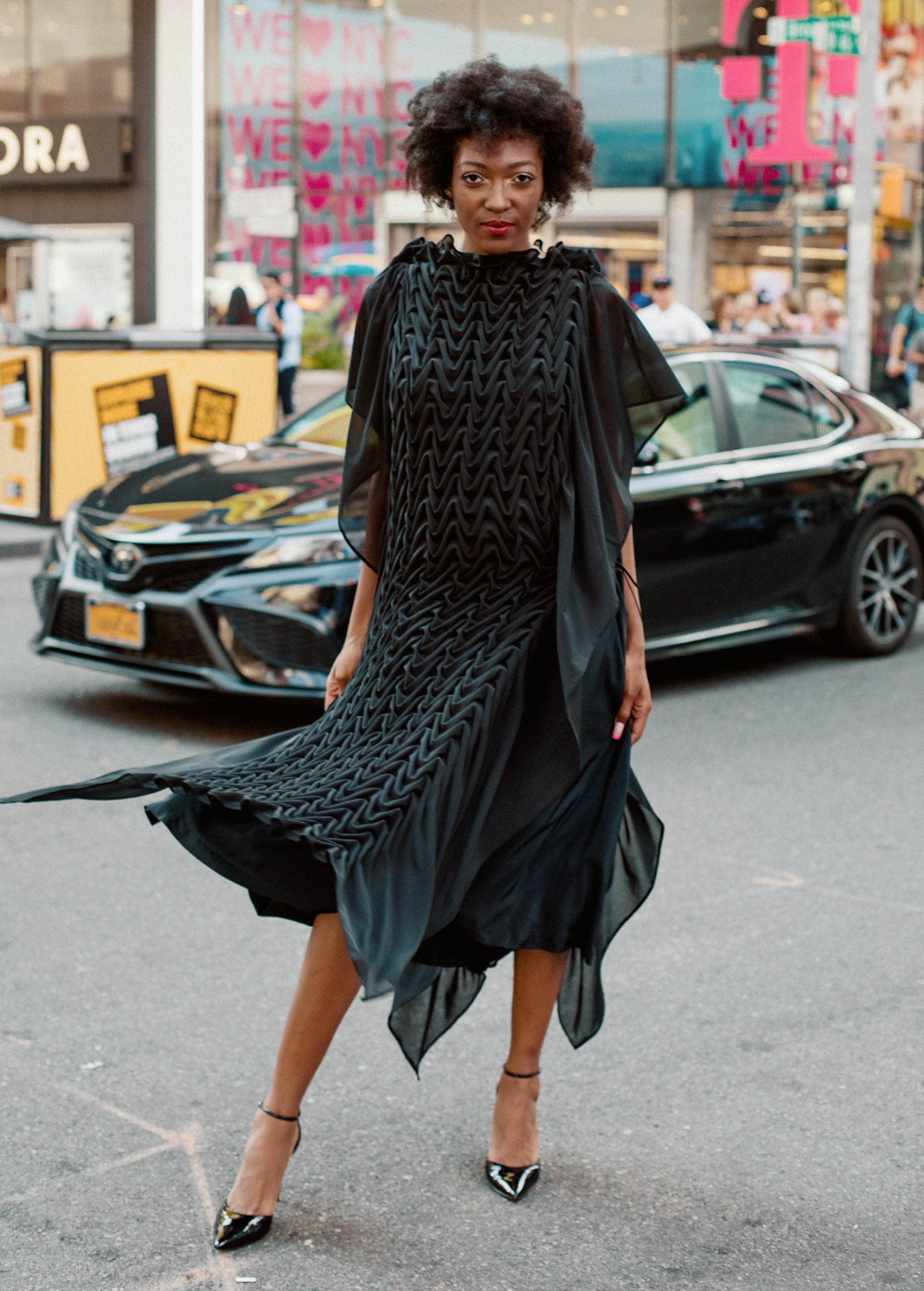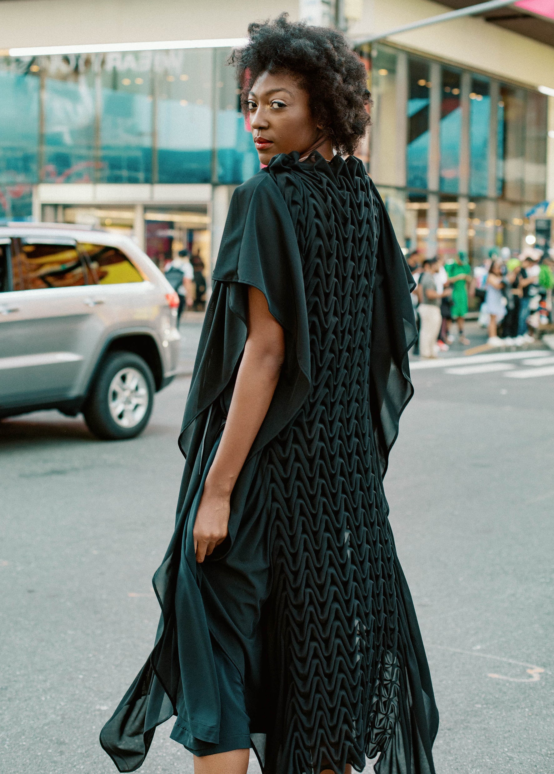 The dark wave dress is composed of two layers, a satin silk slip dress and a semi-transparent mesh cover.