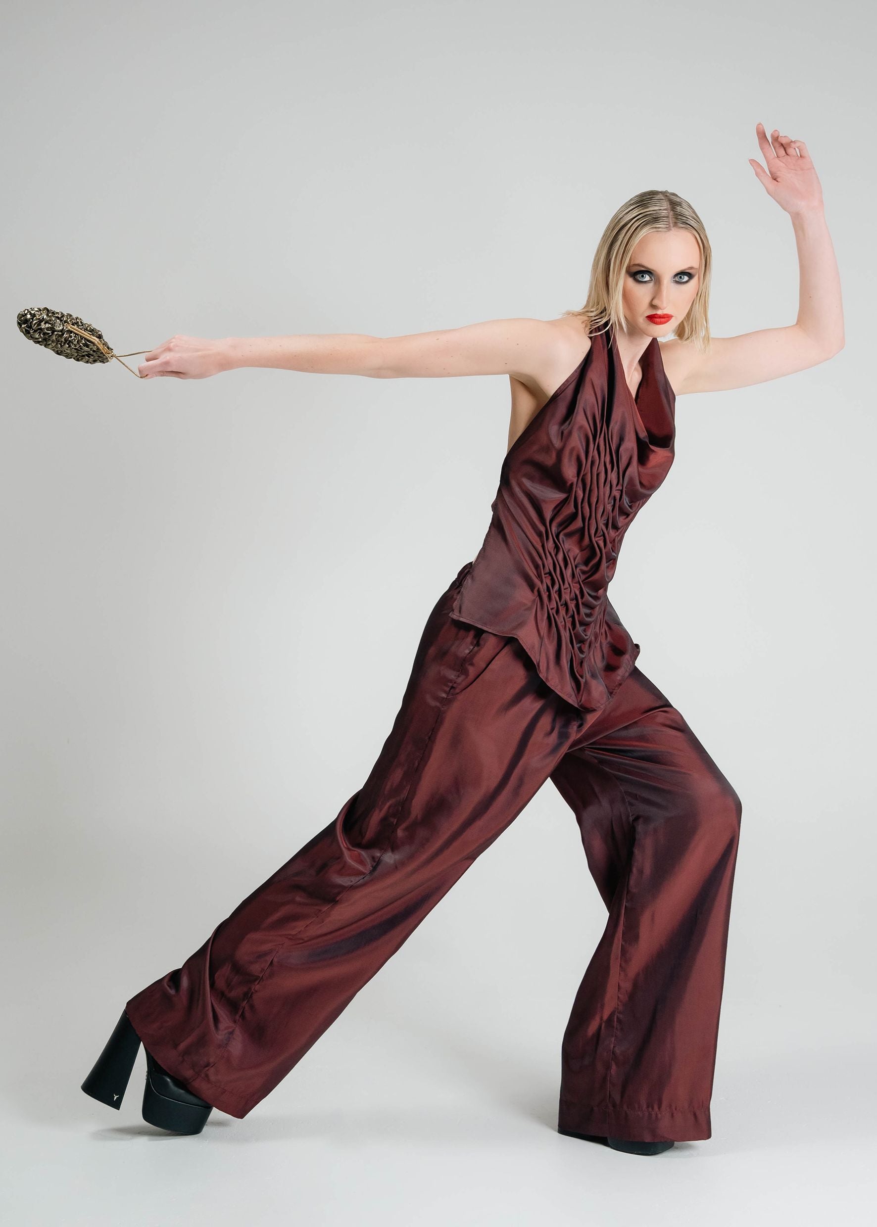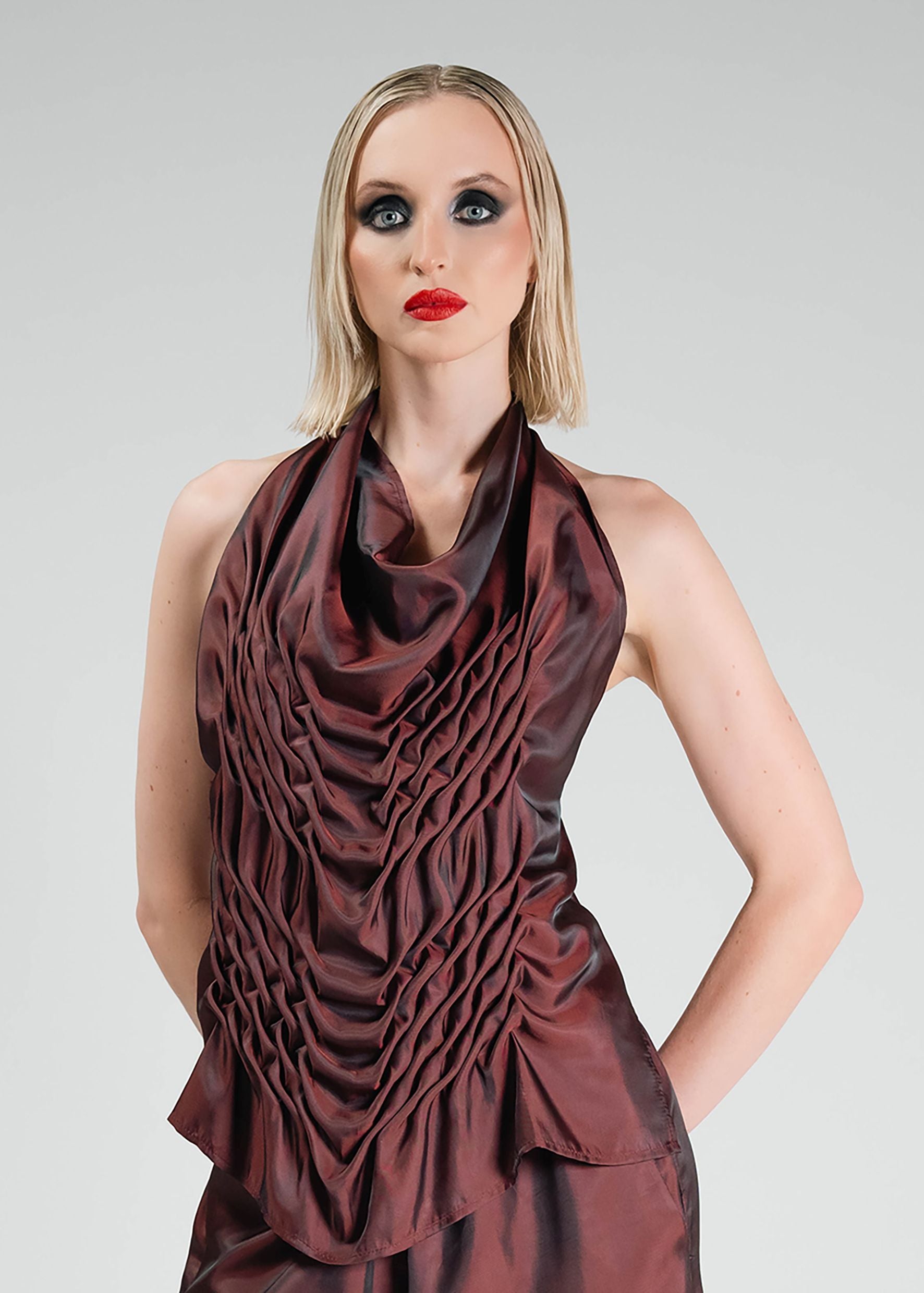 The warp and weft of this woven polyester creates distinct and changing shades of burgundy, grey and black from different angles. It produces an elegant illusion like a liquid metal with the body movement.
