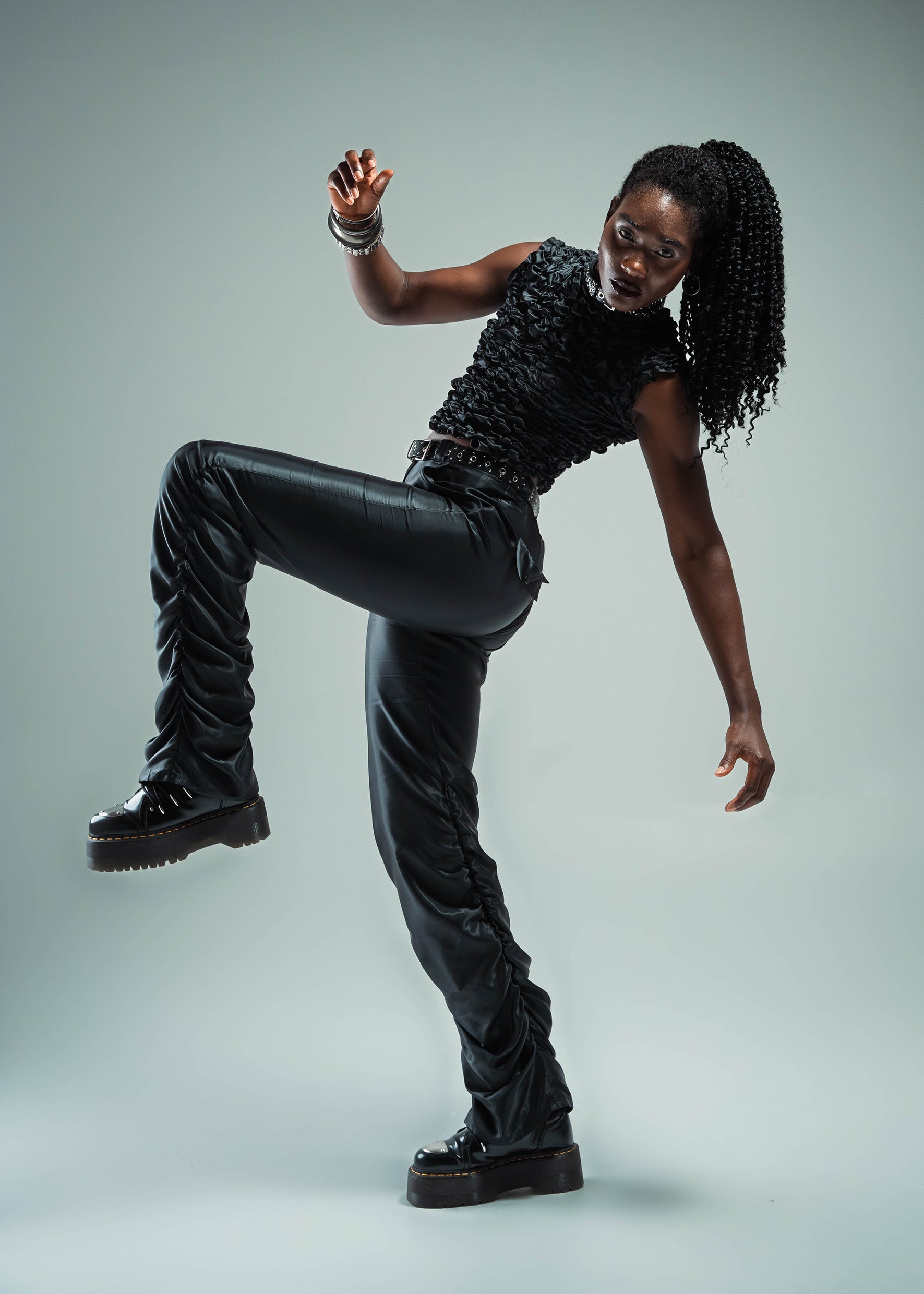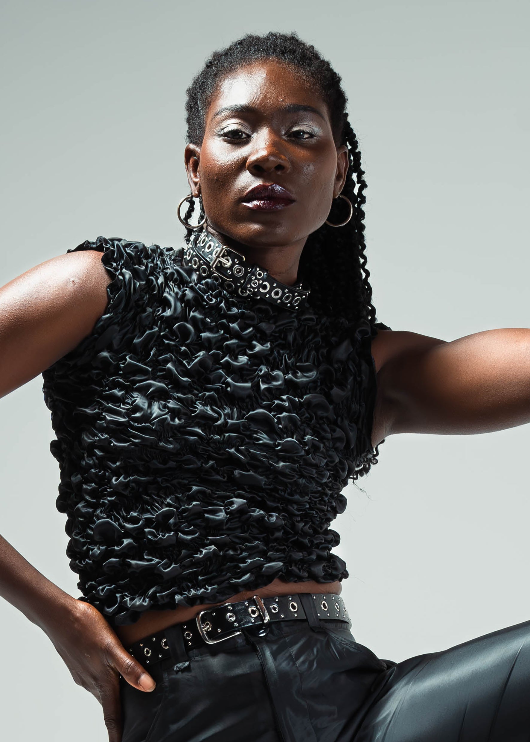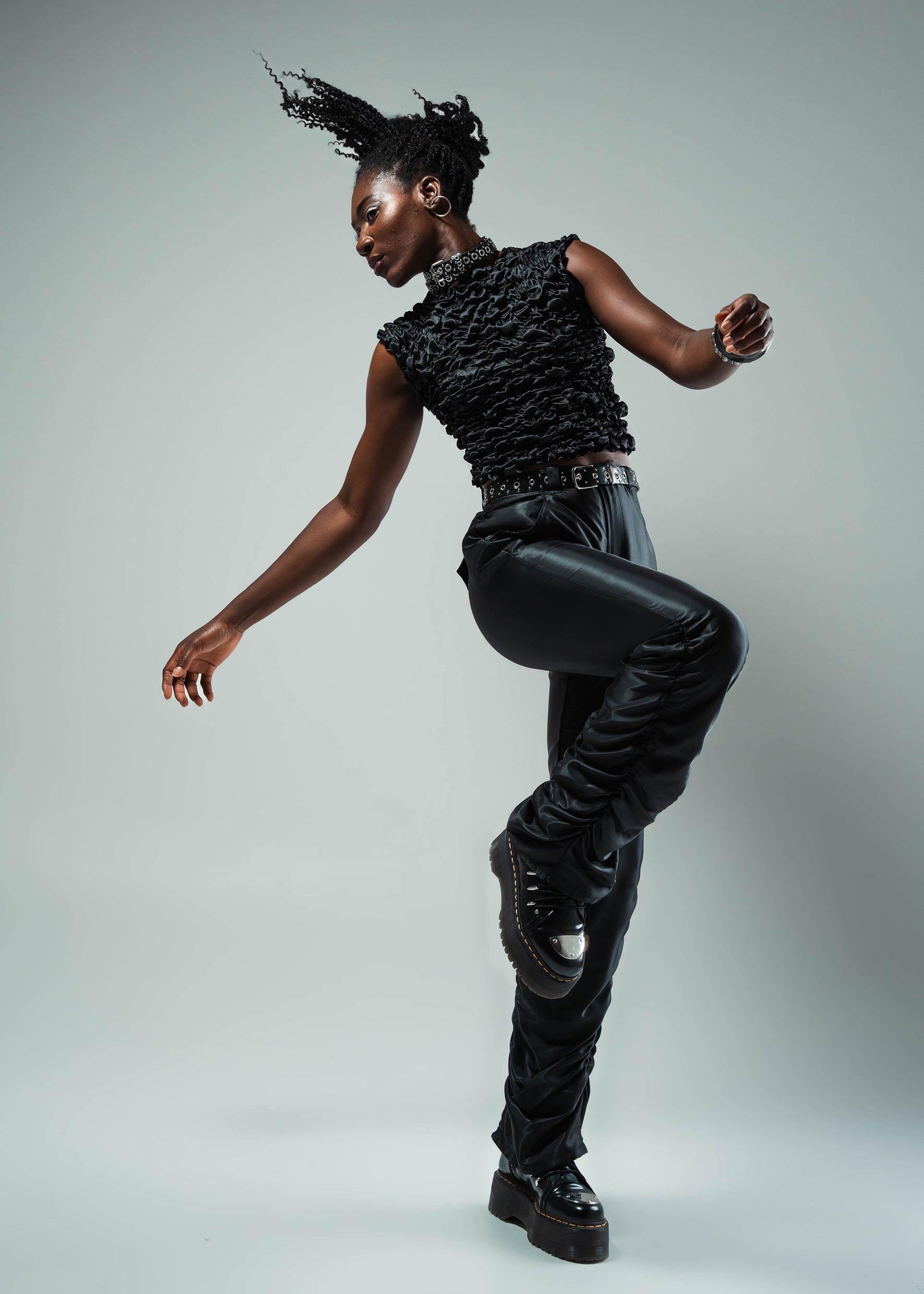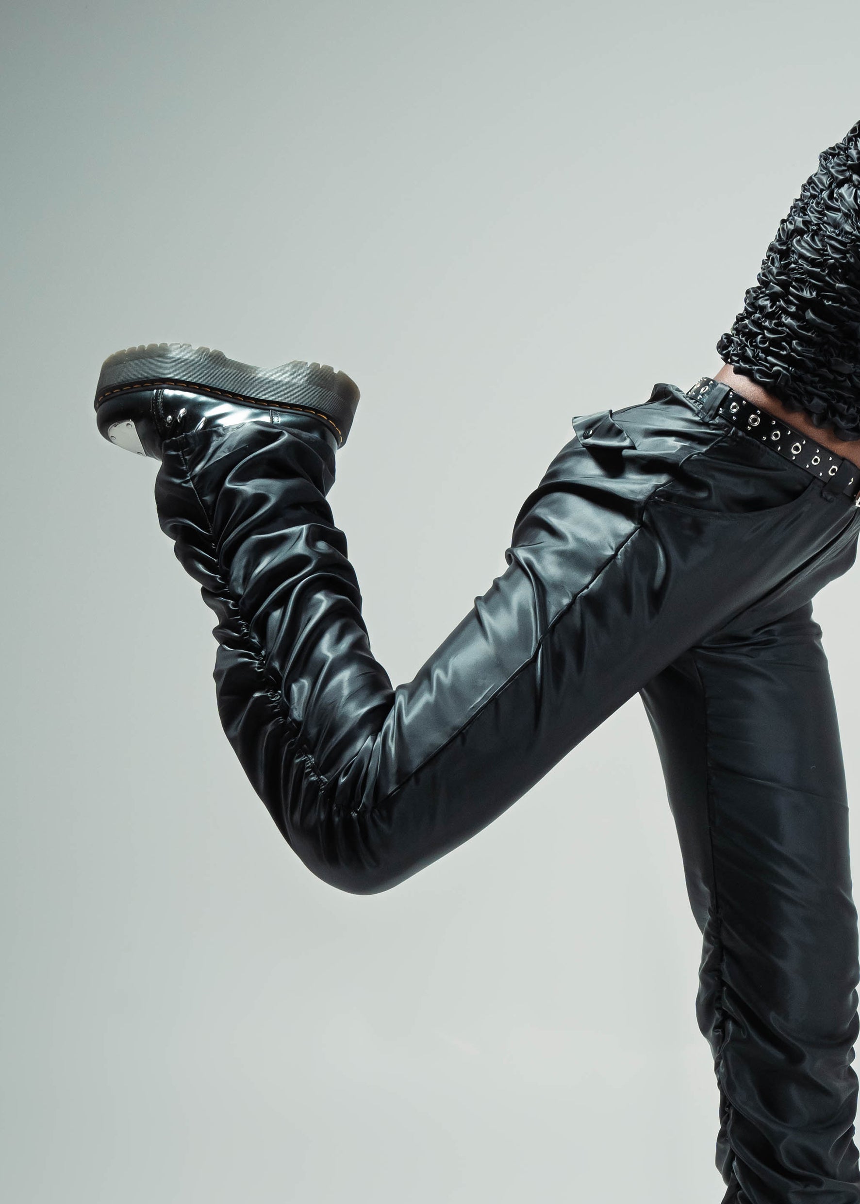 The tank top features a machine random embellishment, creating a special textured pattern on the front and back. The pants are also embellished and textured on the bottom part of the legs.