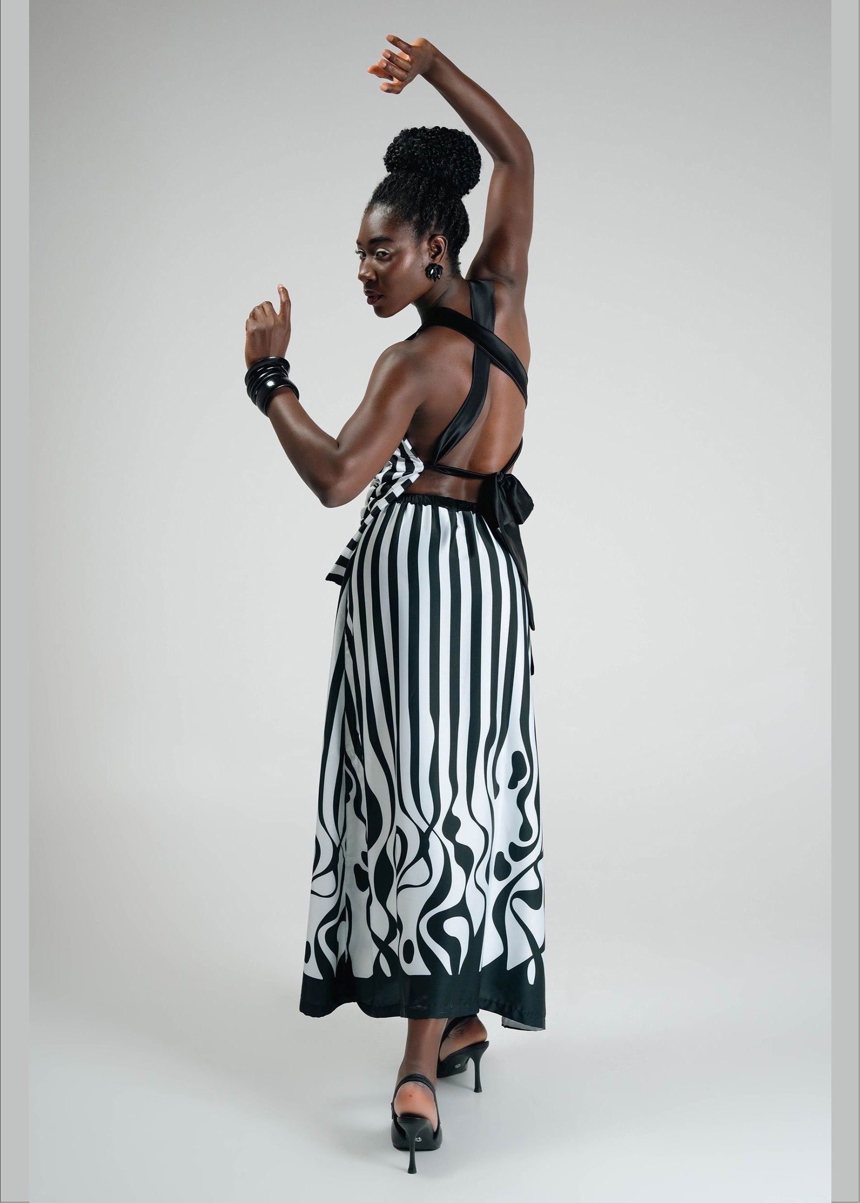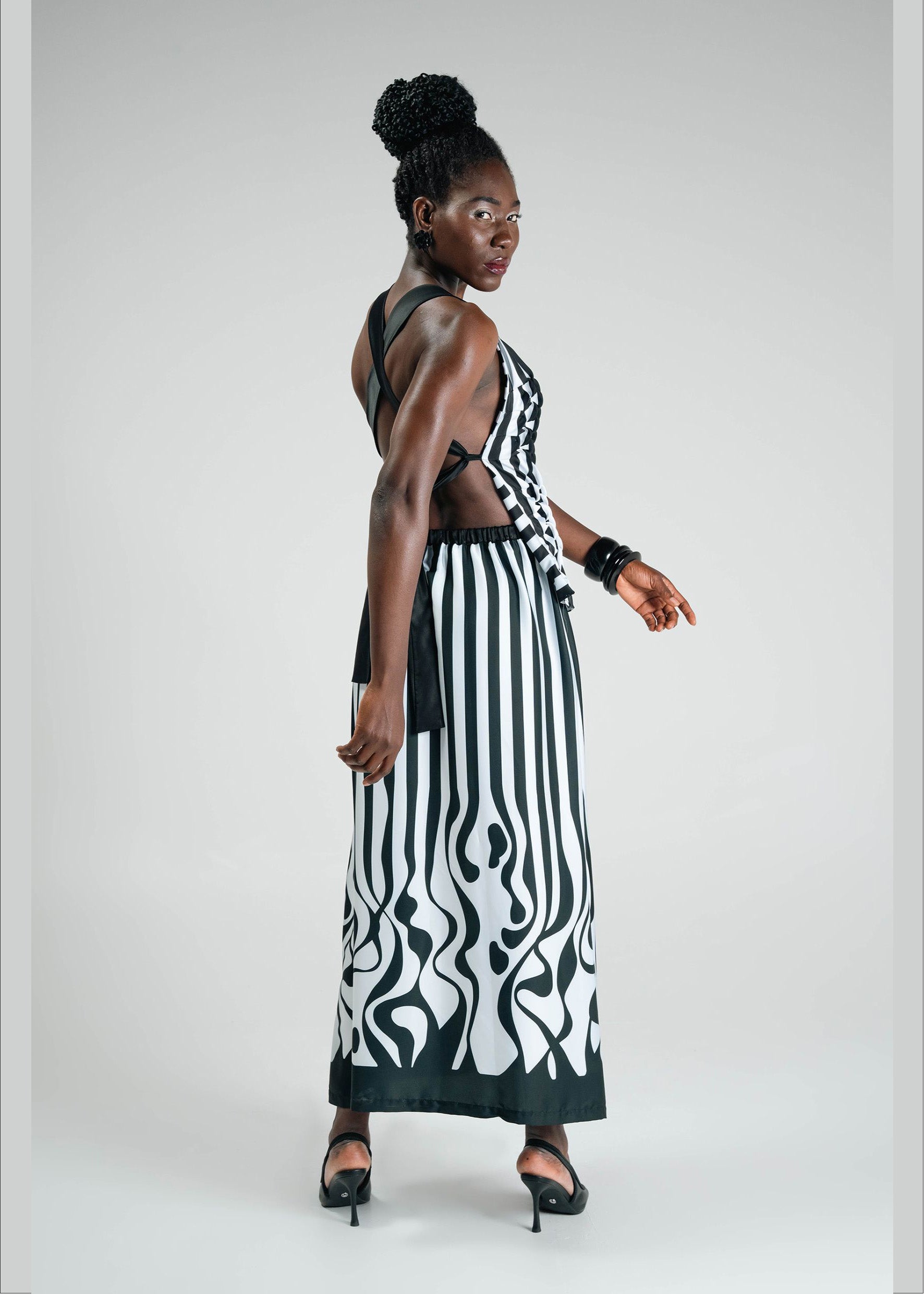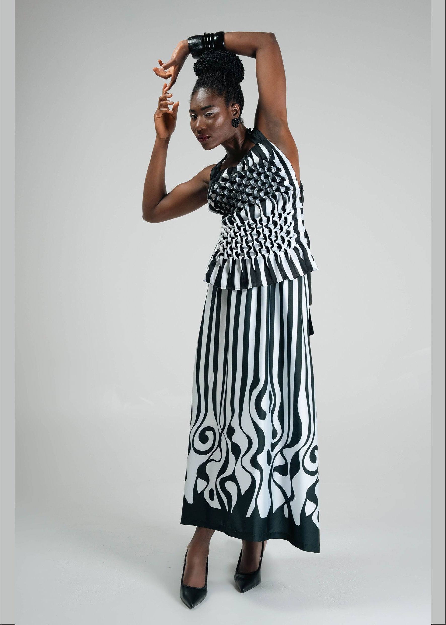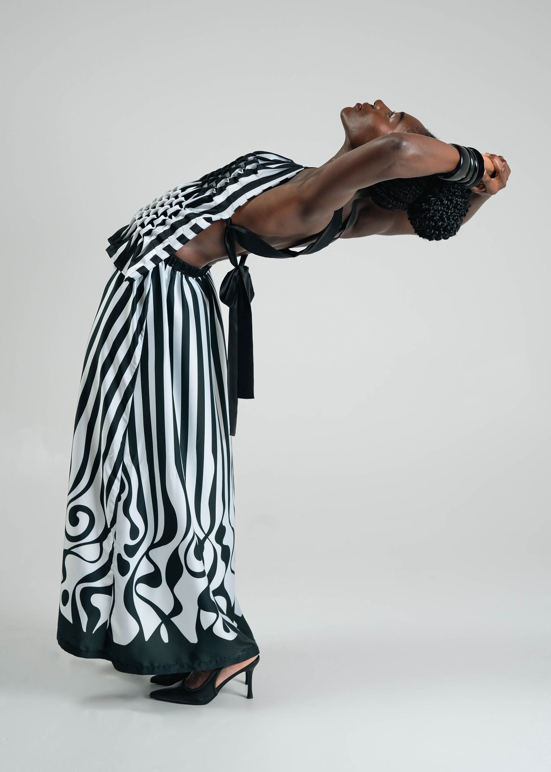 The long skirt with elastic on the waist has an original print by Outer, perfectly composing with the top.