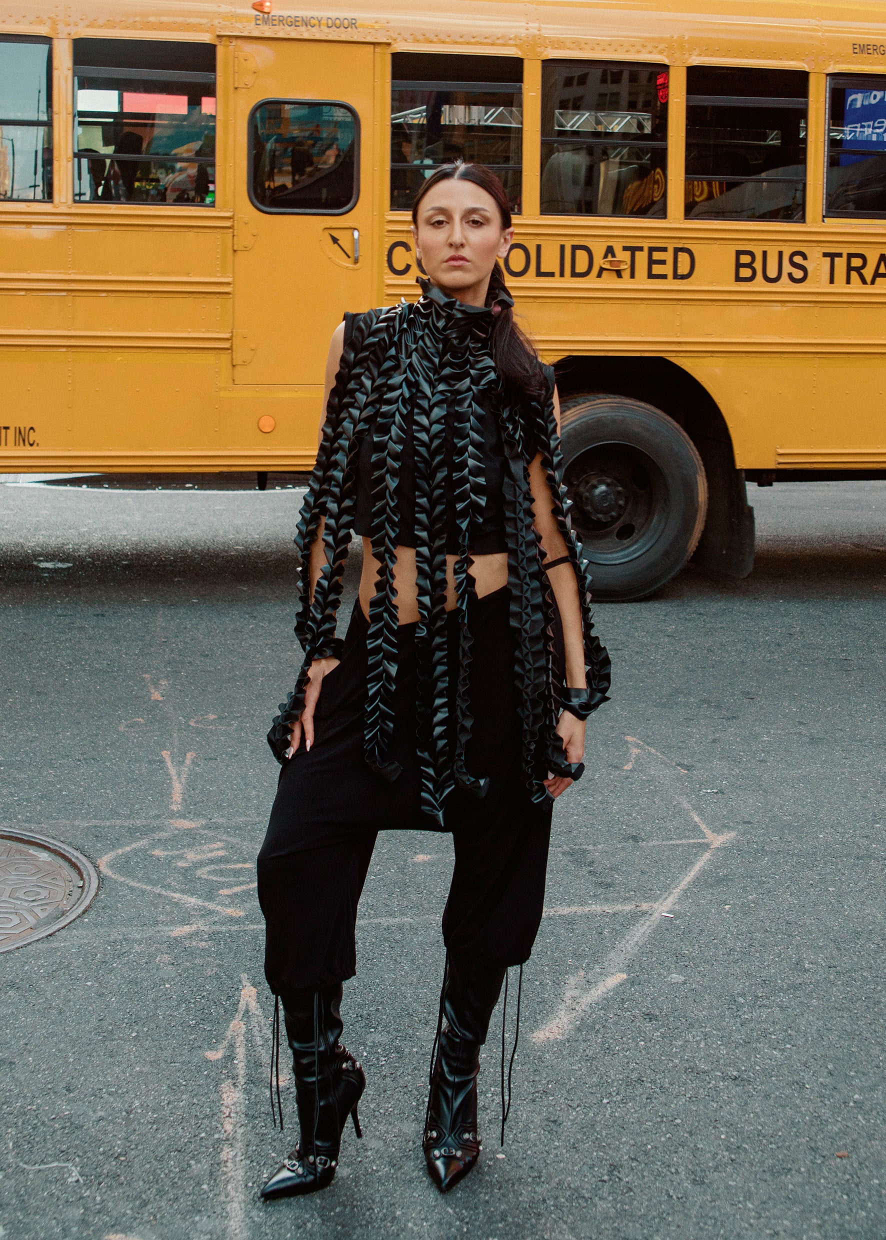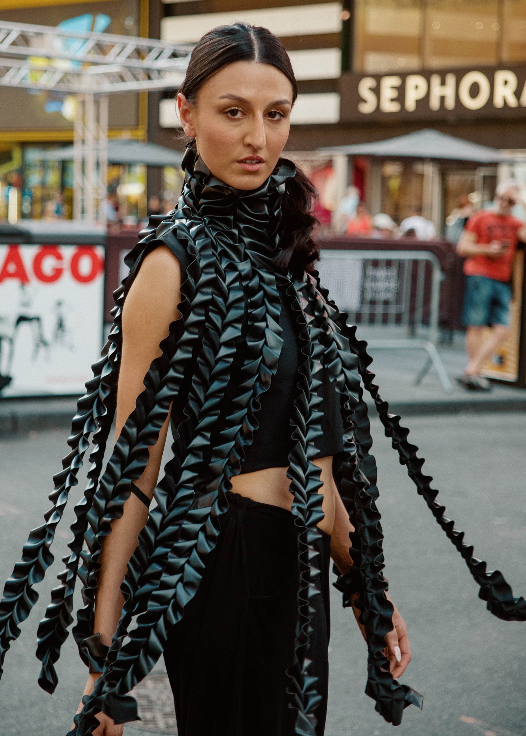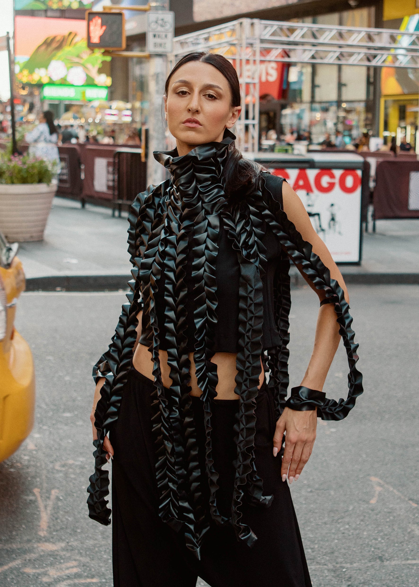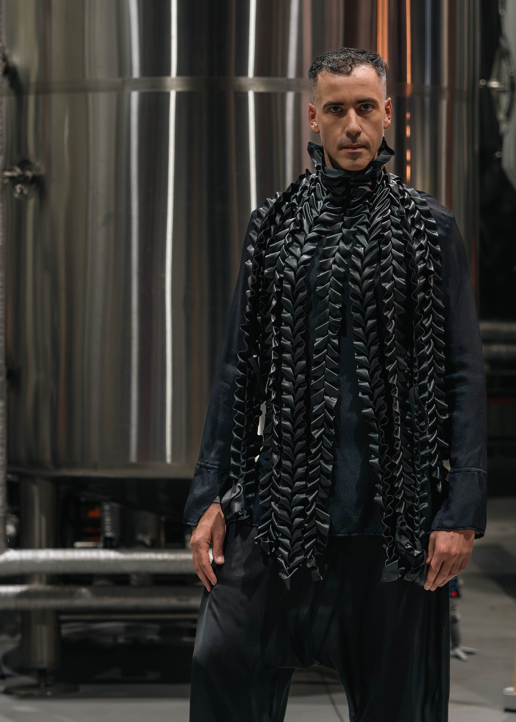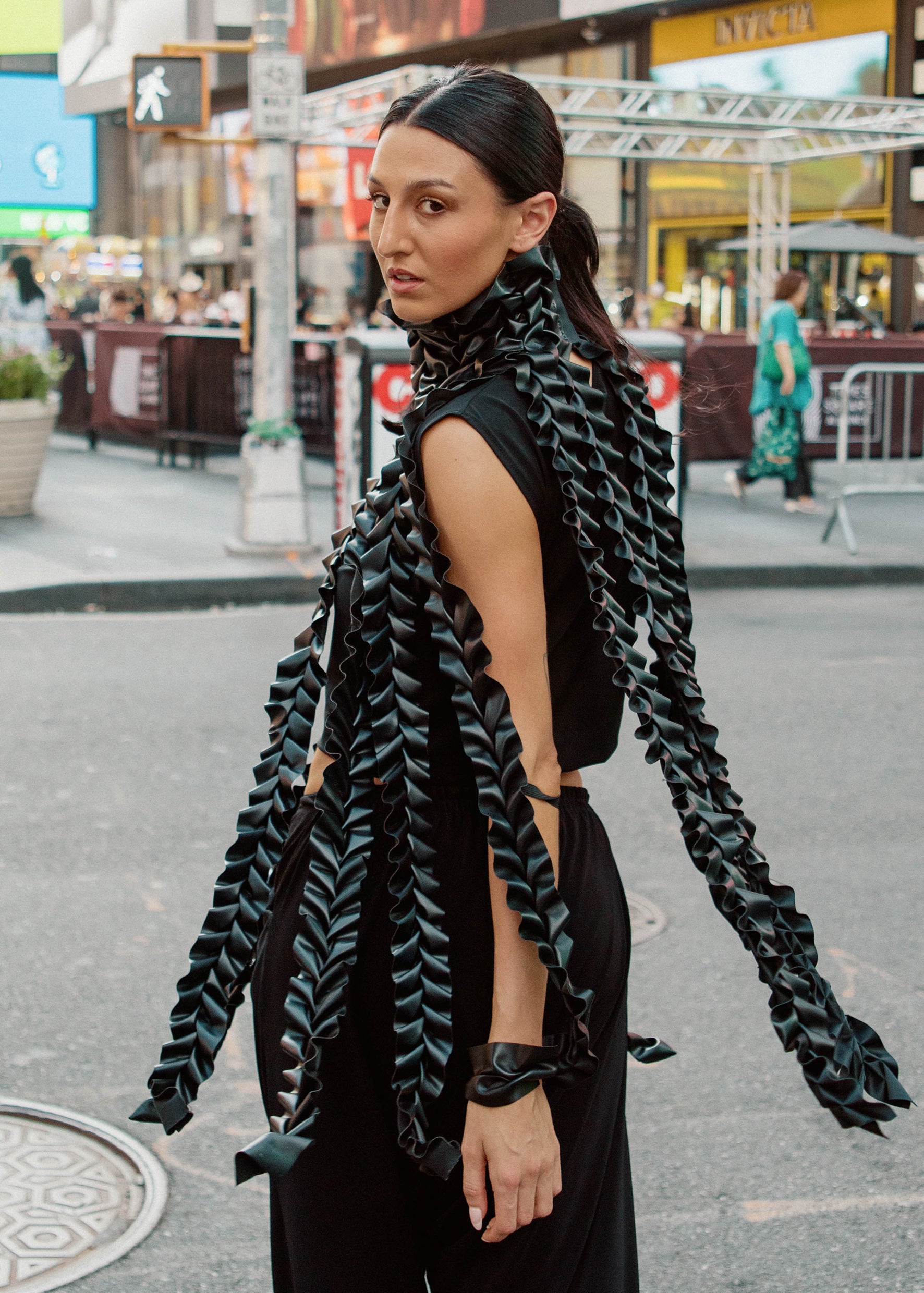 This necklace is made with synthetic leather. It features hand-stitched embellishment throughout, creating a special textured pattern.