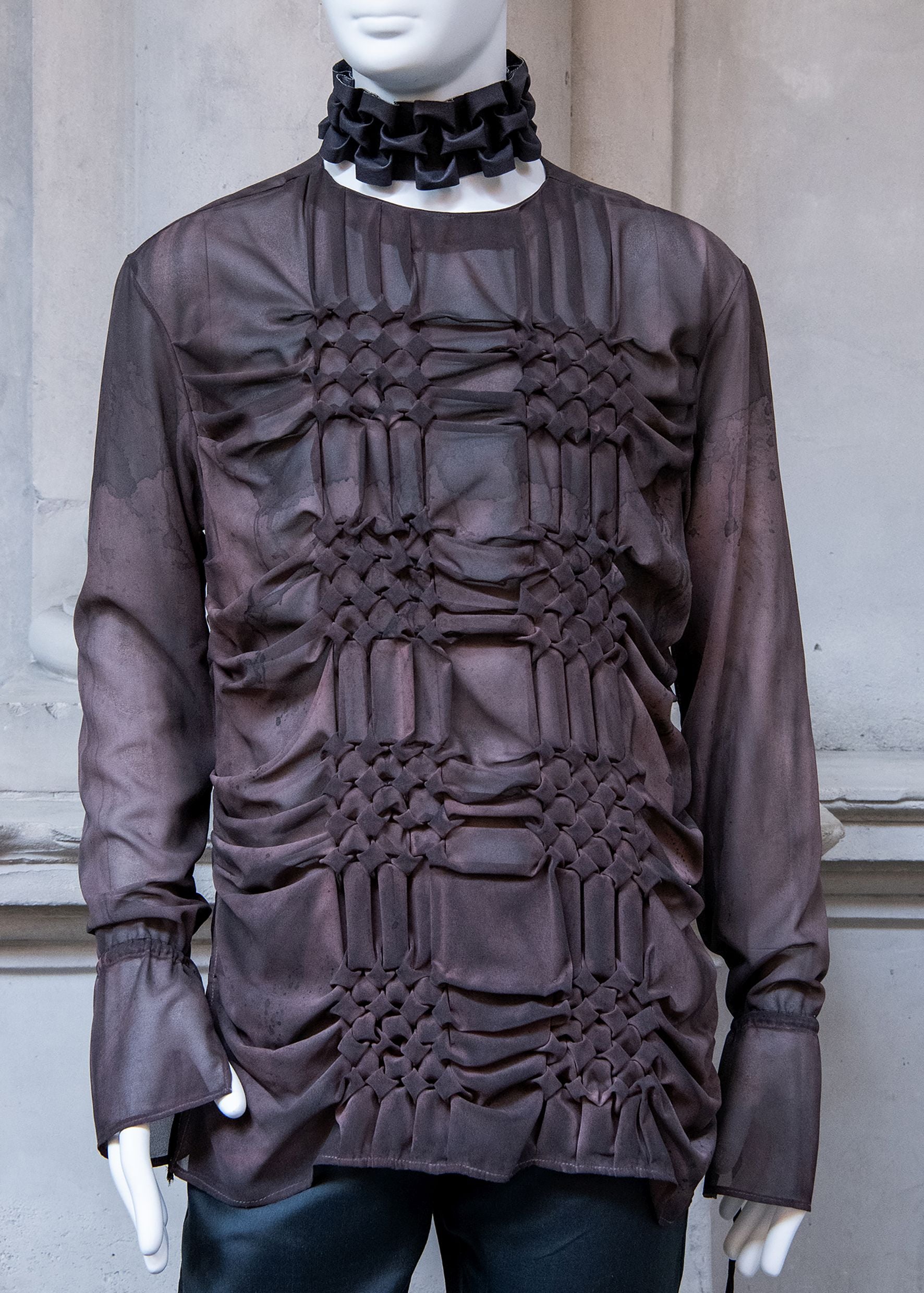 This silk-chiffon top features a hand-stitched embellishment, creating a special textured pattern on the front and on the back. This top is hand dyed resembling a grey-burgundy marble stone.